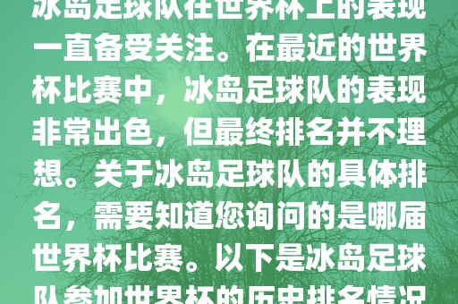 冰岛足球队在世界杯上的表现引人关注。尽管在最近的世界杯比赛中表现出色,但最终排名并不理想。关于其历史排名,需知道具体是哪届世界杯比赛。冰岛足球队在世界杯赛场上留下了深刻的足迹。