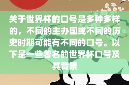 关于世界杯的口号是多种多样的,不同的主办国或不同的历史时期可能有不同的口号。以下是一些著名的世界杯口号及其背景